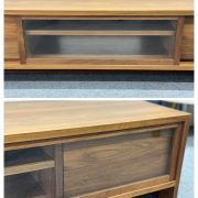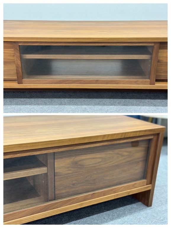 幅180cmと広々としており、中央はスライド式のガラス扉、両サイドは引き出しとなっており収納力も抜群。
