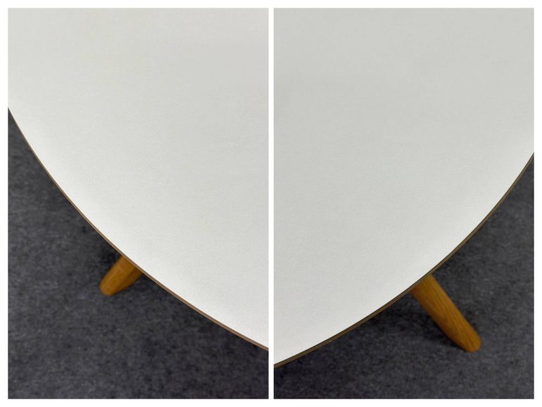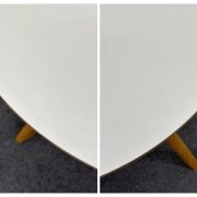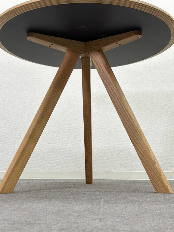 シリーズの一貫した特徴的な角度の脚に、コントラストをきかせたテーブルトップを組み合わせたデザインは、個性的な魅力を放っています。