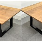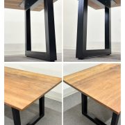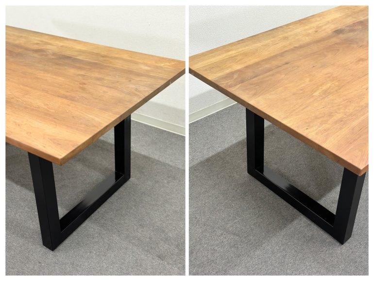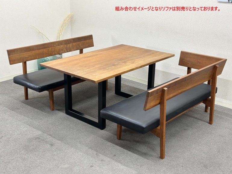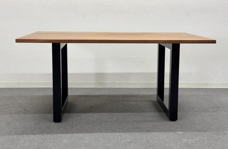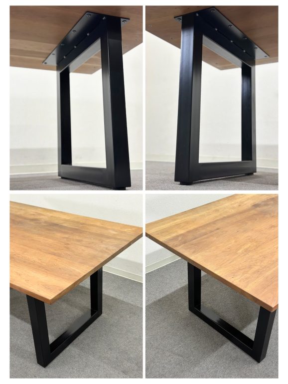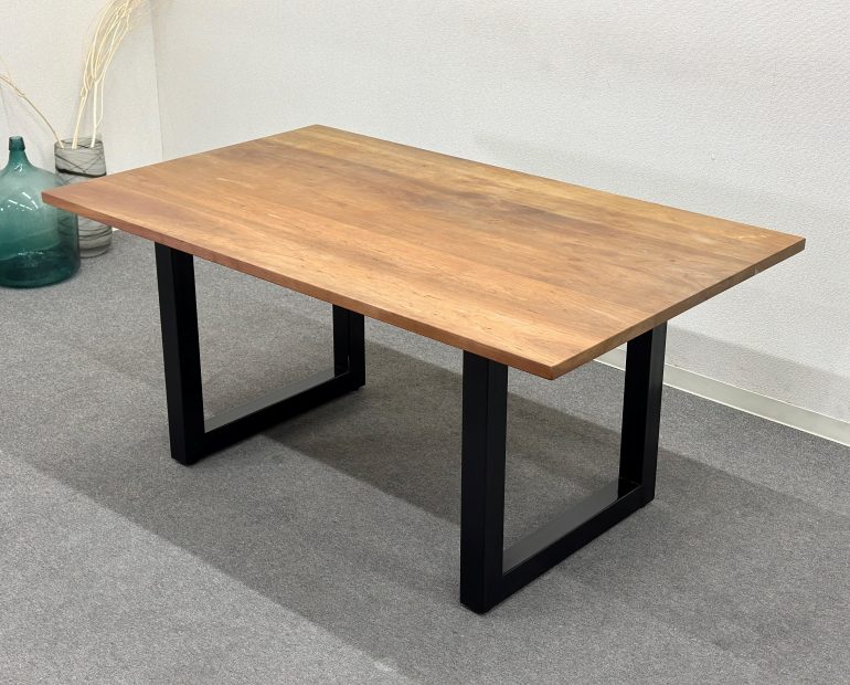 無垢材の天板と黒いスチール脚を組み合わせた「プリミティブ・モダン」なデザインが特徴。