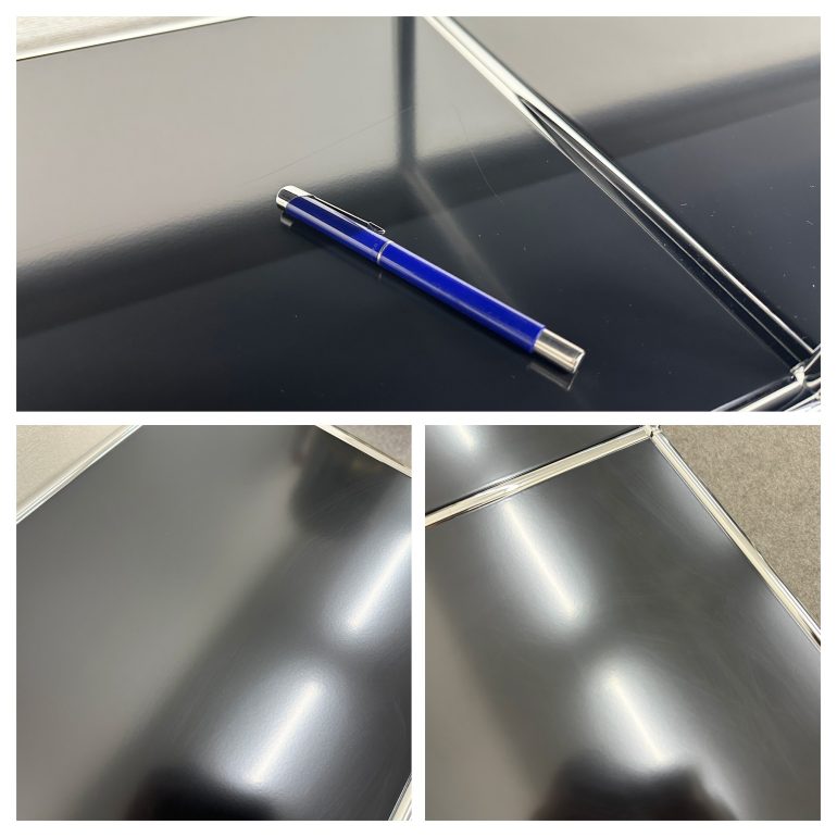 ・ほぼ未使用品となりますが、天板上にやや細かなスレキズ感、二段目にややはっきり見えるスレキズがあります。そのほかは、ほぼ目立たず全体的には綺麗な状態です。