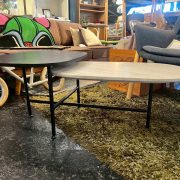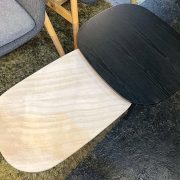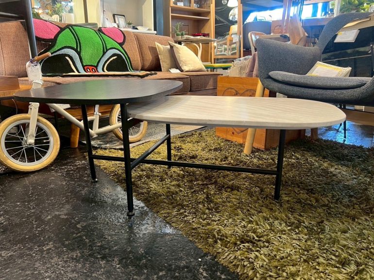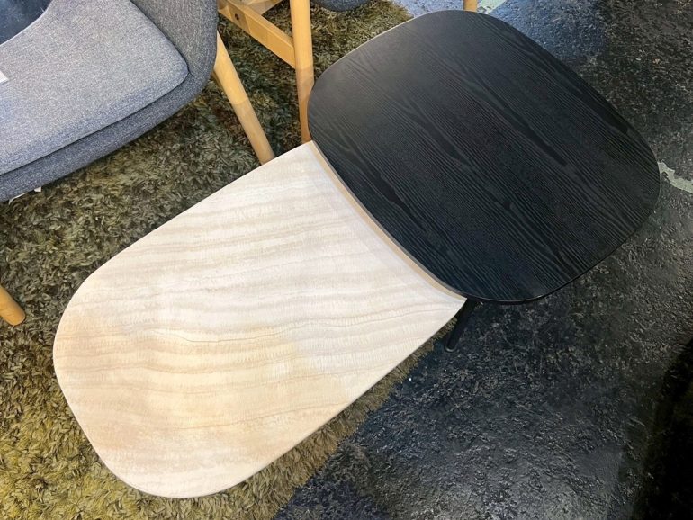 高低差をつけた大小2枚の天板が特徴的なデザインで、置くだけでリビングの主役となるアートピースのような存在感を放ちます。