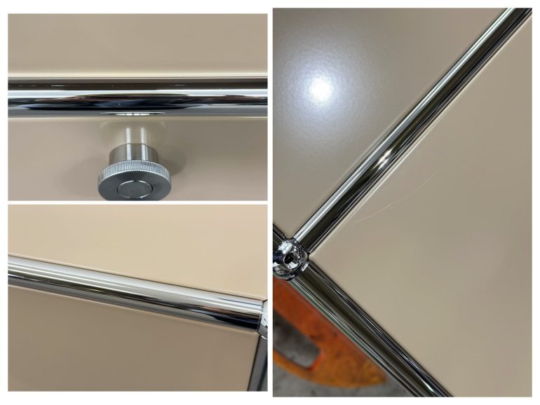 ・ほぼ未使用品となります。角度によってはほぼ見えない程度の薄いキズが天板上に、スチールチューブに若干のスレはありますがほぼ目立ちません。