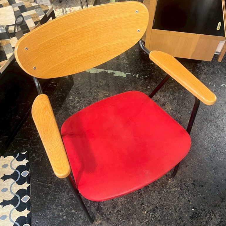 体に沿うように湾曲した成形合板の背もたれが、優しく体をサポートし、アームレストが腕を支えるため安定した座り心地です。